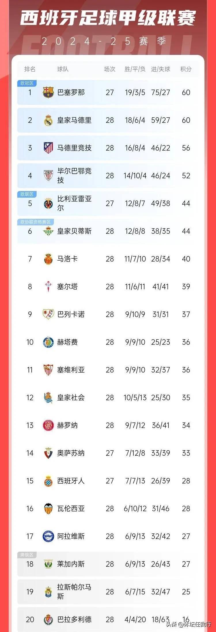 2024-25赛季西甲联赛第28轮,巴萨罗纳凭借着费兰替补双向、莱万、亚马尔的进球客场4:2逆转马竞,豪取联赛七连胜。这样一来联赛少赛一轮积60分追平皇马,靠着净胜球优势登顶积分榜榜首。马竞遭遇两连败,积56分排名第3,终于结束了西甲三足鼎立的局面。